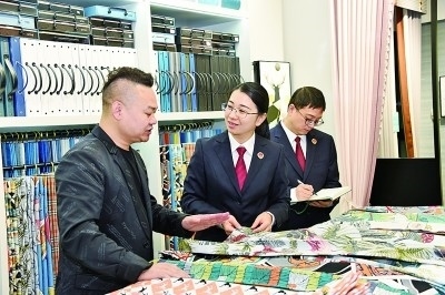 浙江省紹興市柯橋區(qū)被稱為“國際紡都”。2022年,柯橋區(qū)人民檢察院通過大數(shù)據(jù)監(jiān)督模型,監(jiān)督糾正62件花樣著作權(quán)虛假訴訟案件,入選2022年知識產(chǎn)權(quán)檢察十大案事例。圖為辦案人員在走訪商戶??聵騾^(qū)人民檢察院供圖