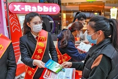 天津法院“巾幗普法志愿者”為群眾解讀婦女權(quán)益保障法內(nèi)容。