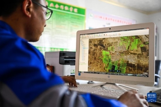 4月12日,在通遼市科爾沁左翼中旗腰林毛都鎮(zhèn),一家農(nóng)業(yè)合作社的負責人查看今年耕種的衛(wèi)星地圖。
