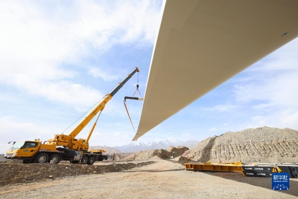4月21日在新疆克孜勒蘇柯?tīng)柨俗巫灾沃轂跚】h拍攝的等待吊裝的風(fēng)機(jī)葉片。