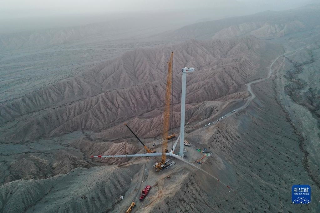 4月22日,在新疆克孜勒蘇柯?tīng)柨俗巫灾沃轂跚】h,完成吊裝的風(fēng)機(jī)矗立在昆侖山北麓(無(wú)人機(jī)照片)。