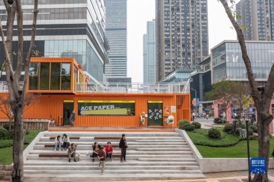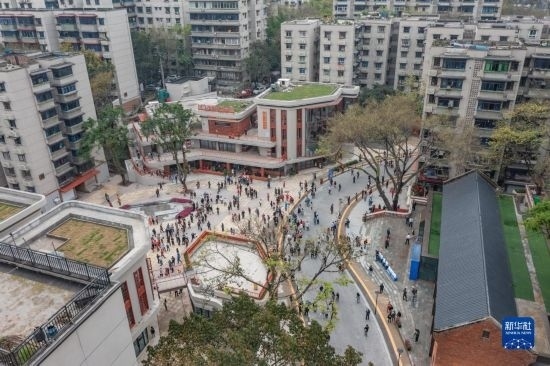 4月28日,在竣工亮相的重慶市九龍坡區(qū)謝家灣街道民主村片區(qū)城市更新項目(一期),人們在一處公共空間休息(無人機(jī)照片)。