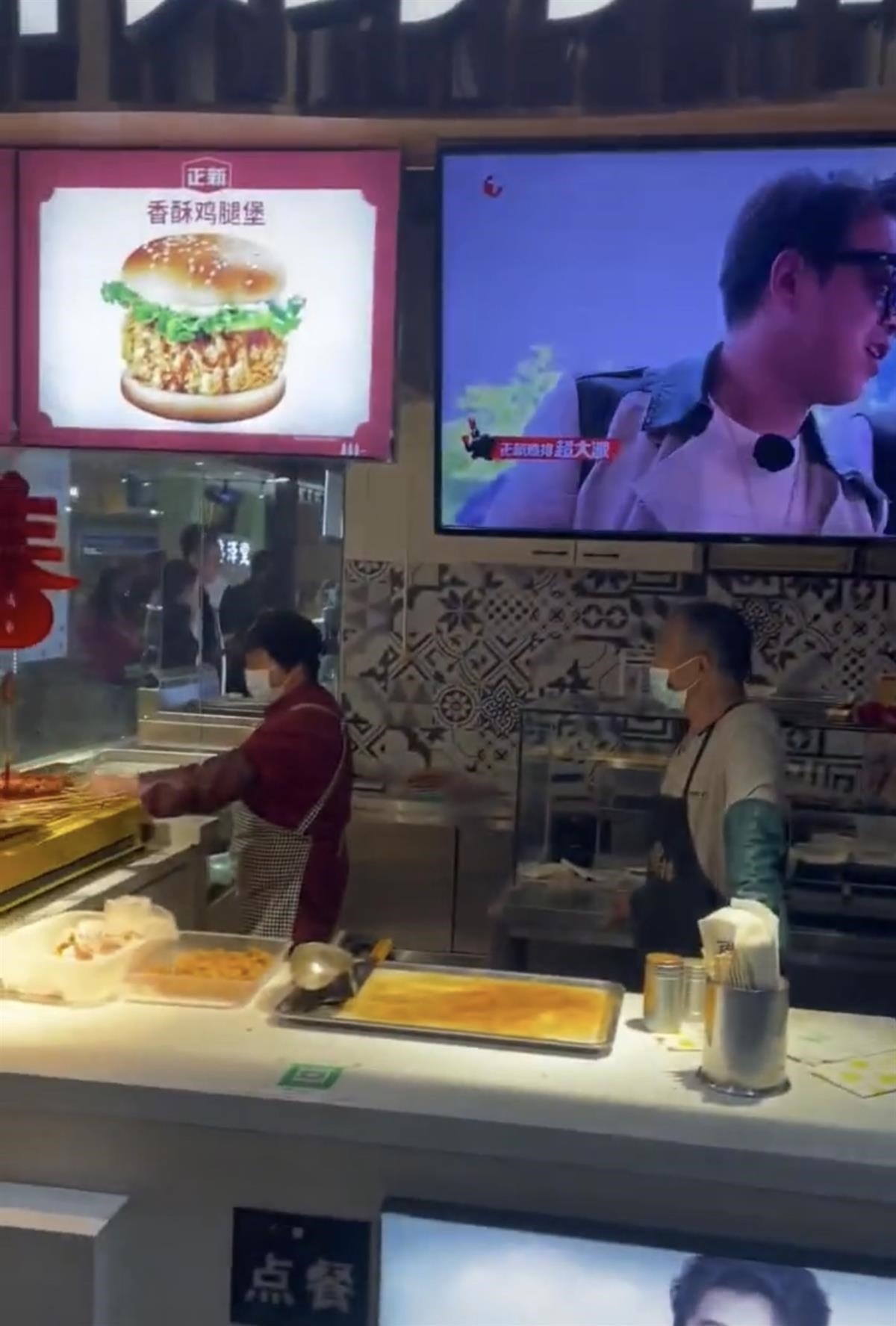 視頻中店內宣傳廣告圖顯示,香酥雞腿堡除了兩片面包外,中間夾有蔬菜和雞肉,與顧客購買到手的漢堡相差甚遠。