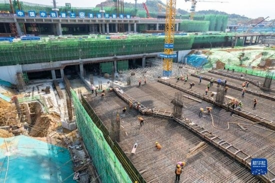 5月3日,在長沙西站建設(shè)工地,工人做混凝土澆筑前準(zhǔn)備(無人機(jī)照片)。