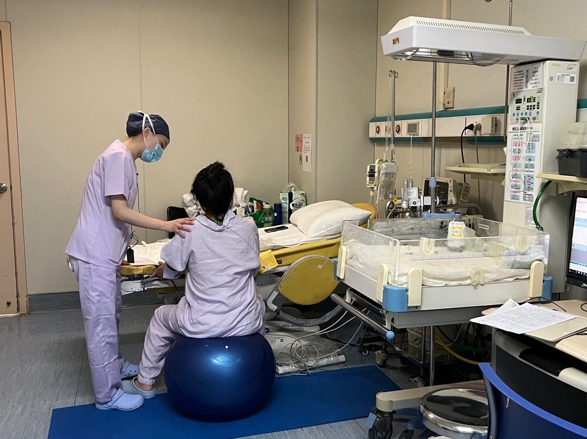 助產(chǎn)士吳靜正幫助一名出現(xiàn)宮縮的孕產(chǎn)婦再瑜伽球上運(yùn)動(dòng)。