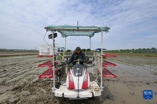 5月5日,在天津市優(yōu)質(zhì)農(nóng)產(chǎn)品開(kāi)發(fā)示范中心,農(nóng)民駕駛插秧機(jī)插秧(無(wú)人機(jī)照片)。