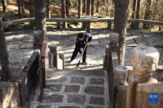 4月21日,在黃山風(fēng)景區(qū)平天矼瞭望哨門口,秦志平在打掃山道。