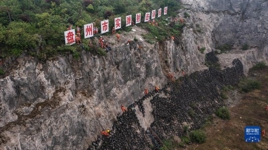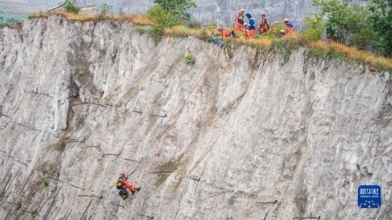 六盤水消防救援支隊隊員在進(jìn)行模擬高山峽谷救援演練(5月11日攝,無人機照片)。