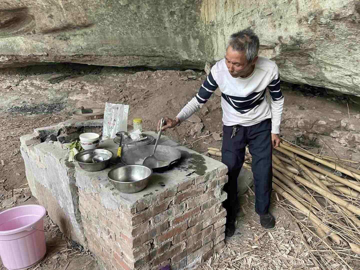 巖洞里不熱,甚至有點(diǎn)冷,馮必全穿了兩件衣服。他告訴紅星新聞?dòng)浾?,他的房子就在這個(gè)巖洞的上方,莊稼地就在巖洞下方,因此他對這個(gè)巖洞很熟悉,“冬暖夏涼,也不潮濕,其實(shí)比上面的房子更適合居住,但沒有水、電?!瘪T必全說,他每天去四弟家里提水、充電,衣服就在附近水塘洗。