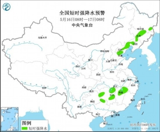 全國(guó)短時(shí)強(qiáng)降水預(yù)警(5月16日08時(shí)-17日08時(shí))。圖片來(lái)源:中央氣象臺(tái)網(wǎng)站