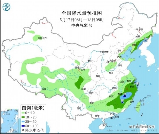 5月17日08時(shí)至18日08時(shí),吉林東部、遼寧東部、川西高原北部、江南中東部和南部、廣東北部等地的部分地區(qū)有中到大雨,其中,江西東部、福建西北部等地局地有暴雨(50~55毫米)。新疆北疆北部、西藏南部、內(nèi)蒙古中東部、吉林東部、遼東半島、甘肅南部、河北南部和東北部、浙江中部等地的部分地區(qū)有4~6級(jí)風(fēng)。