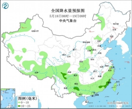 5月18日08時(shí)至19日08時(shí),新疆沿天山地區(qū)和伊犁河谷、西藏南部和東部、川西高原、內(nèi)蒙古東北部、青海西部、山西中部、河北北部、西南地區(qū)東南部、江漢西部、江南中東部和南部、華南大部等地的部分地區(qū)有小到中雨。新疆北部、西藏南部、內(nèi)蒙古中部、吉林中部、遼東半島、江西北部、浙江北部等地的部分地區(qū)有4~6級(jí)風(fēng)。