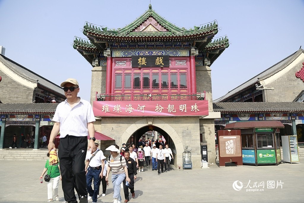天津古文化街位于海河西岸,是國(guó)家5A級(jí)旅游景區(qū)、津門(mén)十景之一。5月16日,旅客從古文化街的戲樓走出。人民網(wǎng) 崔新耀攝