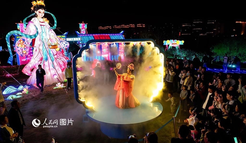 5月15日晚,山西太原晉陽(yáng)湖桃花島,精彩的舞蹈演出和美輪美奐的燈組裝置吸引眾多游客觀賞。人民網(wǎng)記者 王帆攝