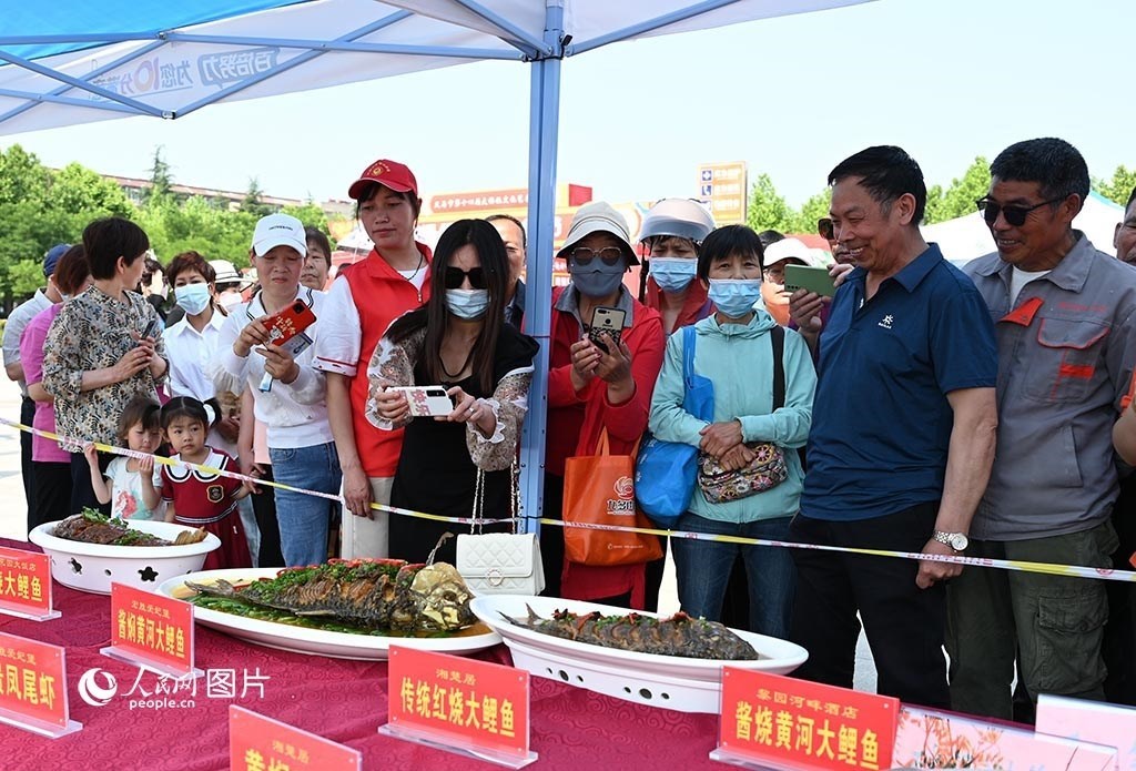 5月17日,“中國(guó)旅游日”主題周活動(dòng)期間,河南省義馬市舉辦“櫻紅五月”美食節(jié),集中展示當(dāng)?shù)氐奶厣朗场⒚麅?yōu)特產(chǎn),為了讓游客有更好的體驗(yàn),當(dāng)?shù)?2家飯店還進(jìn)行了精彩紛呈的廚藝大比拼。活動(dòng)現(xiàn)場(chǎng),游客在圍觀經(jīng)典豫菜“紅燒黃河大鯉魚(yú)”。人民網(wǎng)記者 王玉興攝