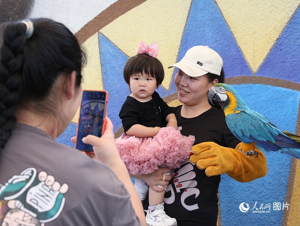 5月18日,雄安郊野公園辛瑪森林動(dòng)物樂(lè)園內(nèi),家長(zhǎng)帶著孩子正與表演動(dòng)物互動(dòng)。人民網(wǎng) 李兆民攝