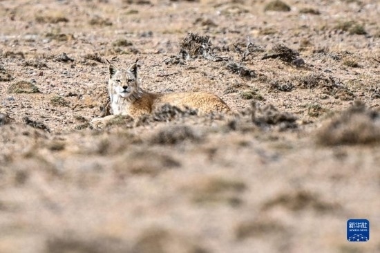 一只猞猁在阿爾金山國家級(jí)自然保護(hù)區(qū)休息(5月25日攝)。