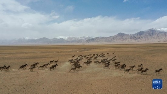 一群藏野驢在阿爾金山國家級(jí)自然保護(hù)區(qū)奔跑(5月23日攝,無人機(jī)照片)。