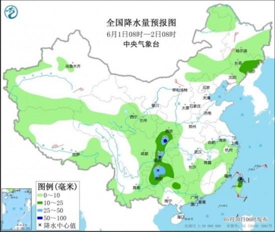 全國降水量預(yù)報(bào)圖(5月30日08時-31日08時)