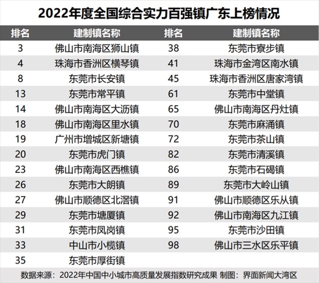 中國中小城市發(fā)展指數(shù)研究課題組、國信中小城市指數(shù)研究院去年發(fā)布的《2022年中國中小城市高質(zhì)量發(fā)展指數(shù)研究成果》顯示,在全國百強(qiáng)鎮(zhèn)名單中,廣東共有29個鎮(zhèn)上榜。其中,東莞虎門鎮(zhèn)位列全國第20名。