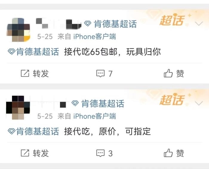 在社交平臺里,能看到不少網(wǎng)友表示,“找代吃”“接代吃”?!敖哟浴币?guī)則一般有兩種,一種是“訂單費用對方付,玩具歸對方,餐食歸自己”;另一種是明碼標價,如,“接代吃65包郵,玩具歸你?!?/p>