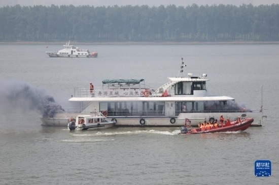 6月2日,在水域救援實(shí)戰(zhàn)演習(xí)現(xiàn)場,消防救援人員駕駛快艇模擬救援事故船上的遇險群眾。