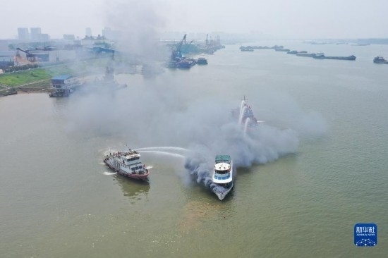 6月2日,在水域救援實(shí)戰(zhàn)演習(xí)現(xiàn)場,消防救援人員駕駛消防艇在模擬水上滅火行動(無人機(jī)照片)。