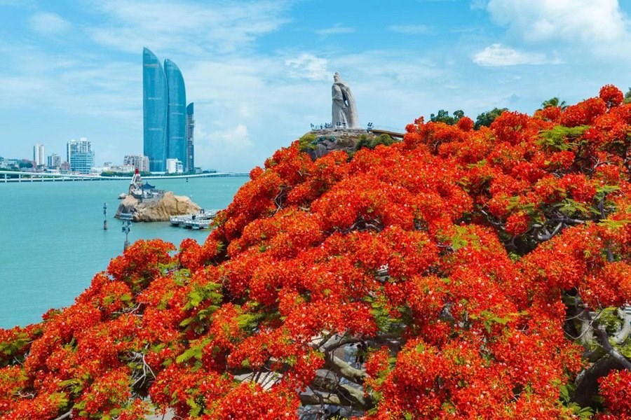 廈門鼓浪嶼上鳳凰花盛開,灼熱的陽光灑向鳳凰木枝頭,光影斑駁,滿眼盡是艷麗的橙紅色,映照出夏日的動人景致。