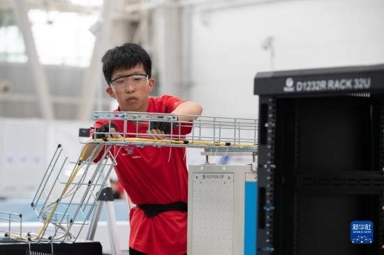 6月6日,選手在進行信息網(wǎng)絡(luò)布線項目比賽。