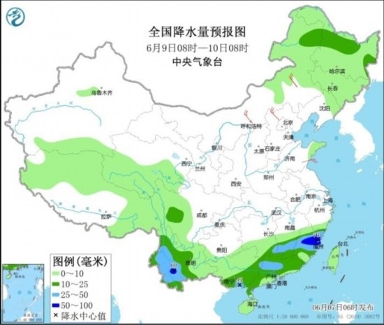7-9日,江南、華南、云貴高原、四川南部等地有中到大雨,局地有暴雨,小時(shí)雨量20-50毫米,局地可達(dá)60毫米以上;華北、黃淮、東北地區(qū)等地有陣雨或雷陣雨,局地伴有雷暴大風(fēng)或冰雹等強(qiáng)對(duì)流天氣,中央氣象臺(tái)6月7日06時(shí)發(fā)布強(qiáng)對(duì)流天氣藍(lán)色預(yù)警。