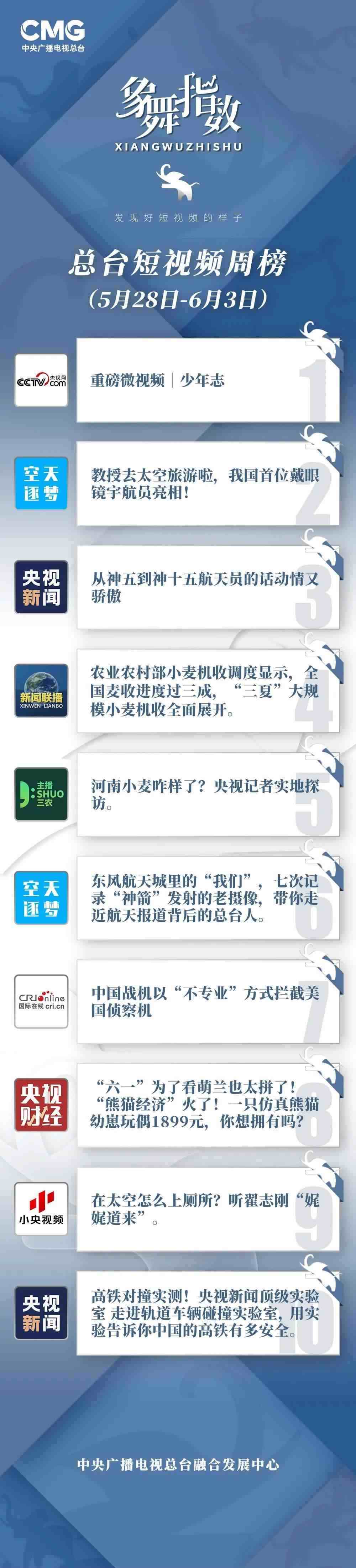 中央廣播電視總臺“象舞指數(shù)”評議品牌,推出主流媒體短視頻周榜、總臺短視頻周榜。在2023年5月28日—6月3日,這些內(nèi)容引發(fā)大眾關注: