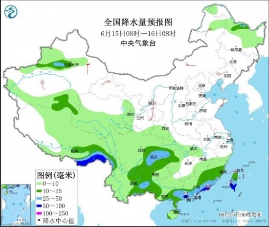 全國(guó)降水量預(yù)報(bào)圖(6月15日08時(shí)-16日08時(shí)) 圖自中央氣象臺(tái)網(wǎng)站