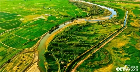 2023年6月15日,甘肅省張掖市,甘州區(qū)靖安鄉(xiāng)、臨澤縣板橋鎮(zhèn)境內(nèi)的黑河兩岸,寬闊的河床、彎曲的河流、農(nóng)作物以及樹(shù)木、蘆葦、濕地在夕陽(yáng)的映照下綠意盎然。