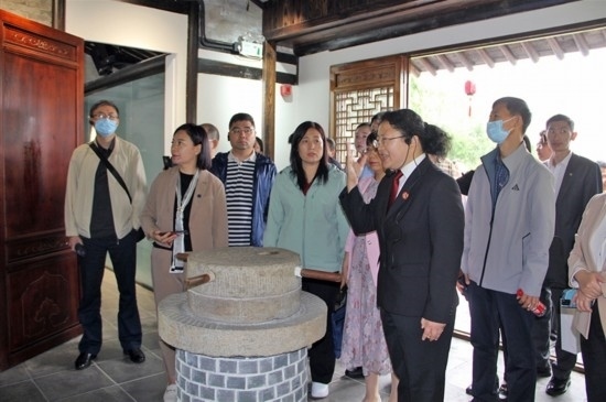 正值初夏,上海市奉賢區(qū)青村鎮(zhèn)吳房村,世外桃源般的江南水鄉(xiāng)風貌引人入勝。沿著吳房村的青石板路,代表們一路考察、一路交流,從三治堂到四堂間,深入了解奉賢區(qū)法院訴源治理平臺“奉法客堂間”工作情況。