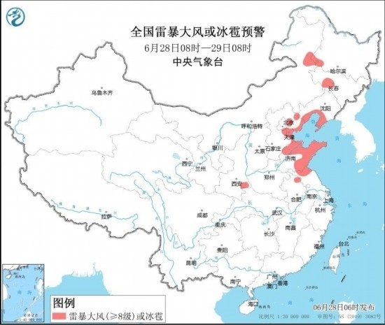 預(yù)計(jì),6月28日08時(shí)至29日08時(shí),遼東半島、北京東部、天津北部、河北東北部、山東中東部、四川東部、陜西南部、重慶大部、湖北西部等地部分地區(qū)有大到暴雨,其中,重慶北部局地有大暴雨(100~140毫米)。上述部分地區(qū)伴有短時(shí)強(qiáng)降水(最大小時(shí)降雨量30~50毫米,局地可超過60毫米),內(nèi)蒙古東北部、黑龍江西南部、吉林中西部、遼寧南部、陜西東南部、河北東部、北京東部、天津、山東北部和東部、安徽北部、江蘇北部等地的部分地區(qū)將有8~10級雷暴大風(fēng)或冰雹天氣,局地風(fēng)力可達(dá)11級(見圖1和圖2)。中央氣象臺6月28日06時(shí)繼續(xù)發(fā)布暴雨藍(lán)色預(yù)警和強(qiáng)對流天氣藍(lán)色預(yù)警。