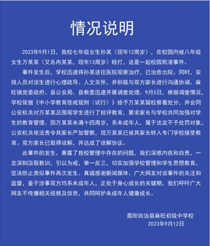 ·重慶酉陽(yáng)初中女生遭欺凌事件進(jìn)展:雙方達(dá)成諒解協(xié)議,打人者已被轉(zhuǎn)入專門學(xué)校接受教育。