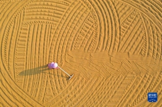 9月14日,河南省寶豐縣龍王溝鄉(xiāng)村振興示范區(qū)的農(nóng)民在晾曬谷子(無人機照片)。
