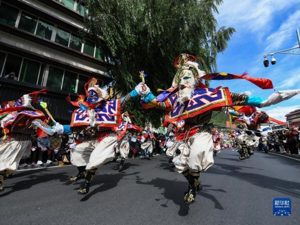 來(lái)自四川省阿壩藏族羌族自治州13個(gè)縣市的近千名演員在馬爾康市街頭開(kāi)展巡游活動(dòng),展示阿壩州各個(gè)地區(qū)的非遺文化。