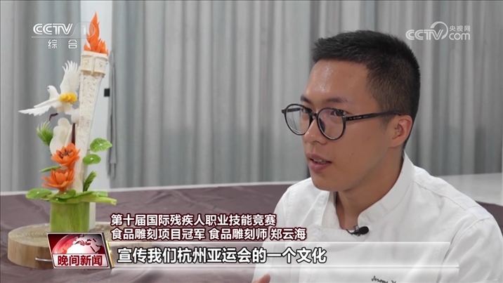 第十屆國際殘疾人職業(yè)技能競賽食品雕刻項(xiàng)目冠軍 食品雕刻師 鄭云海:最近有火炬(傳遞),寓意就是美好、和平,還有吉祥。我想用自己的技能去宣傳我們杭州亞運(yùn)會(huì)的一個(gè)文化。