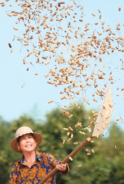 山東省棗莊市市中區(qū)稅郭鎮(zhèn)沙溝村,農(nóng)民在揚曬花生。 孫中喆攝(人民視覺) |