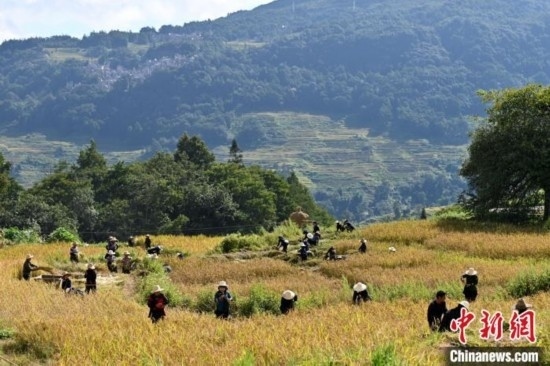 23日,正值秋分時(shí)節(jié),也是第六個(gè)中國農(nóng)民豐收節(jié),哈尼梯田染上了豐收的色彩。哈尼人民在金黃的稻田里割水稻、捉稻花魚,與四方賓客共慶豐收。為了慶祝豐收,當(dāng)?shù)剡€舉行了大型稻作農(nóng)耕實(shí)景表演。身著民族服飾的哈尼族民眾站在田埂上,以稻田為舞臺(tái),以大地山川為背景,唱起悠揚(yáng)的哈尼古歌,手捧水稻,載歌載舞,表達(dá)崇尚自然、感恩自然之情。
