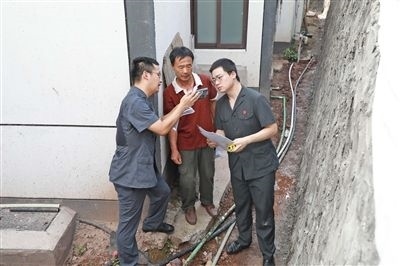 執(zhí)行干警與被執(zhí)行人確認界址。