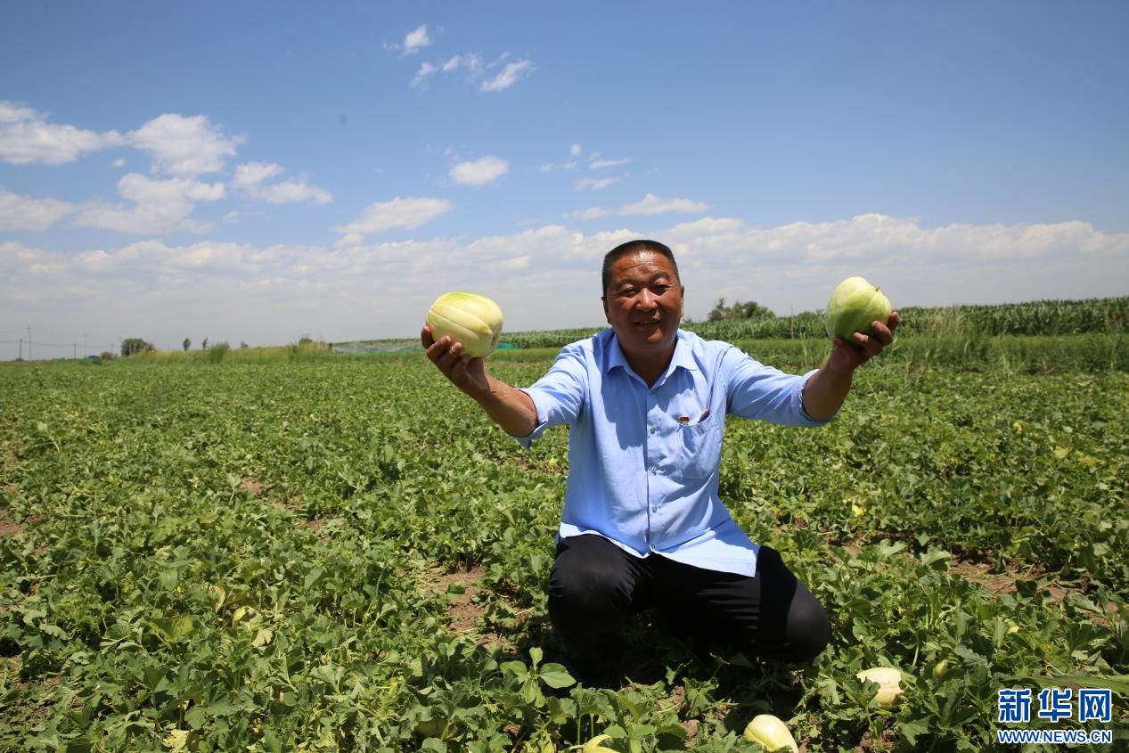 7月6日,土默特左旗口肯板村支書展示香瓜。新華網(wǎng) 楊騰格爾 攝