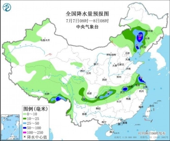 全國降水量預報圖(7月6日08時-7日08時)。圖片來源:中央氣象臺網站