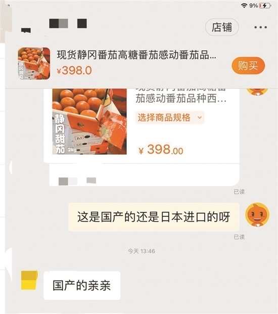 隨后,記者隨機(jī)在電商平臺(tái)選擇三款標(biāo)明是“進(jìn)口水果”的產(chǎn)品進(jìn)行詢問(wèn),結(jié)果對(duì)方均表示自己的水果是“國(guó)產(chǎn)的”。當(dāng)記者詢問(wèn)一電商客服,標(biāo)價(jià)398元兩斤的“現(xiàn)貨靜岡番茄”和標(biāo)價(jià)178元一斤的日本淡雪白草莓是哪里產(chǎn)的時(shí),對(duì)方回答“親親,國(guó)產(chǎn)的”。