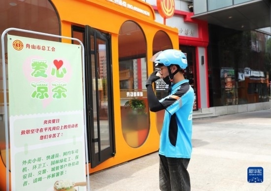 7月7日,外賣配送員在浙江舟山市一處“勞動者驛站”飲用“愛心涼茶”。