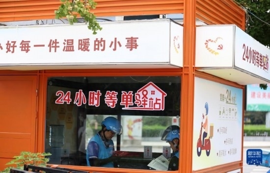7月7日,在山東省臨沂市郯城縣郯城街道一處24小時“等單驛站”,郯城街道社區(qū)工作者為等單的外賣配送員送上毛巾、水杯、防曬袖套等防暑物品。