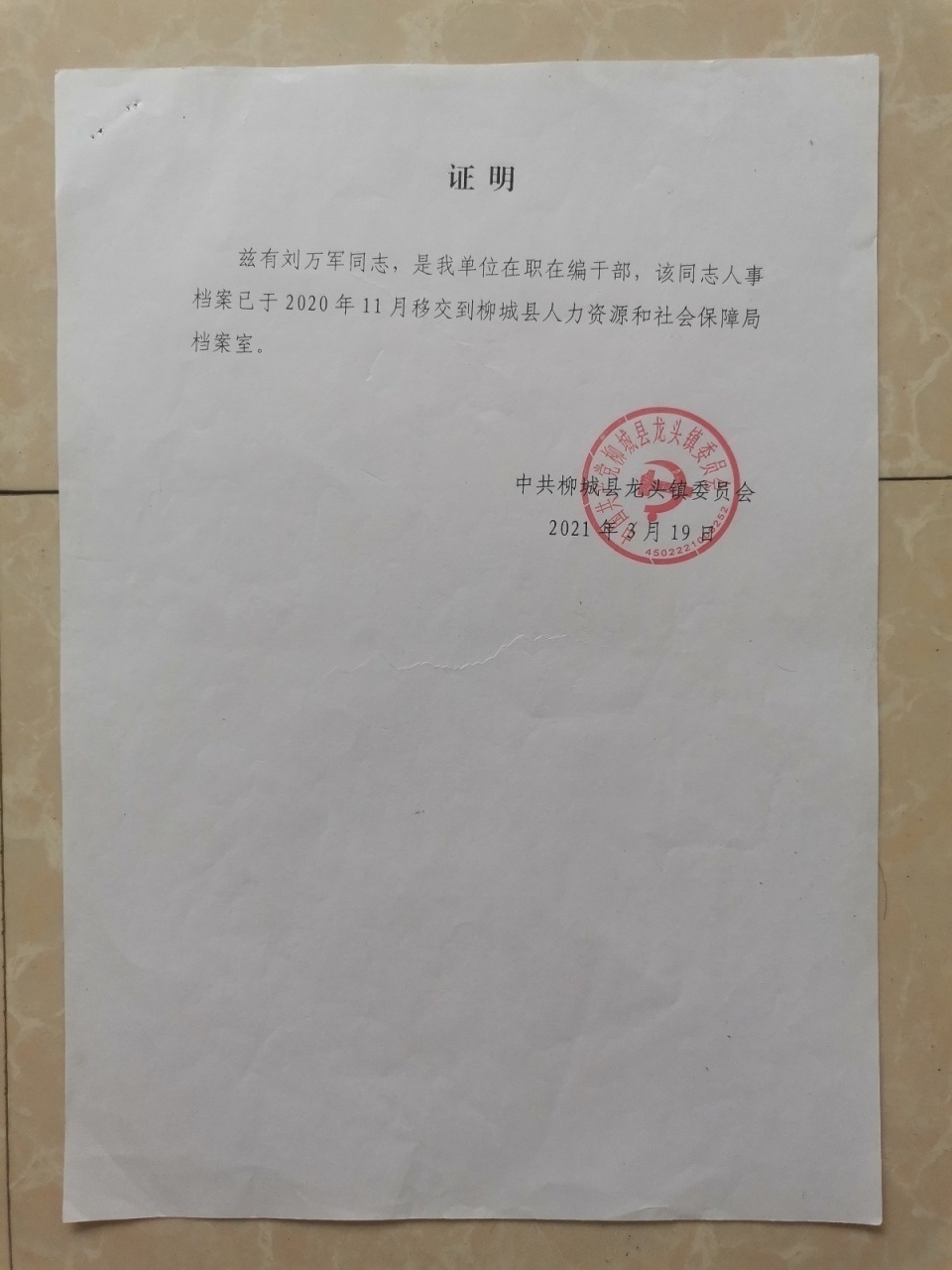 經(jīng)查,劉某某現(xiàn)為柳城縣龍頭鎮(zhèn)鄉(xiāng)村建設(shè)綜合服務(wù)中心事業(yè)單位退休工勤人員。其先后在柳城縣西安鄉(xiāng)、太平鎮(zhèn)、龍頭鎮(zhèn)工作,2022 年1月退休前為柳城縣龍頭鎮(zhèn)事業(yè)單位工勤人員。由于工作調(diào)動,在檔案移交過程中,不慎造成部分檔案缺失。