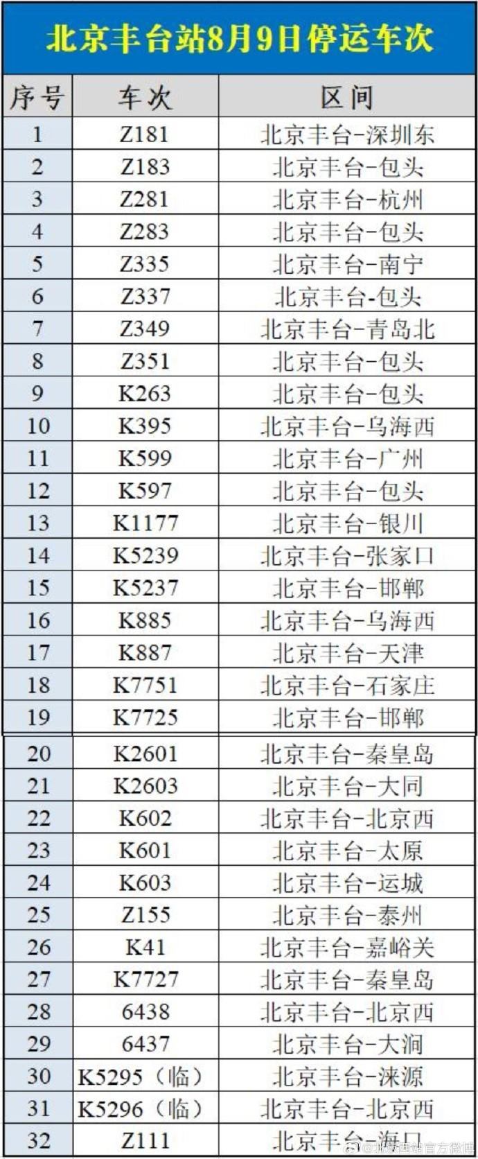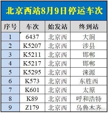央視網(wǎng)消息:據(jù)@北京西站官方微博 消息,受水害影響,8月9日北京西站、北京豐臺(tái)站部分列車停運(yùn),已購買停運(yùn)列車車票的旅客,可于30日內(nèi)辦理全額退票手續(xù)。請廣大旅客合理安排出行,關(guān)注鐵路部門公告。