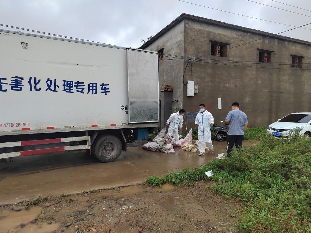 河北省雞澤縣一家蛋雞養(yǎng)殖場門口,專業(yè)人員對養(yǎng)殖場內(nèi)淹死的蛋雞進(jìn)行集中收集裝車。(雞澤縣農(nóng)業(yè)農(nóng)村局供圖)